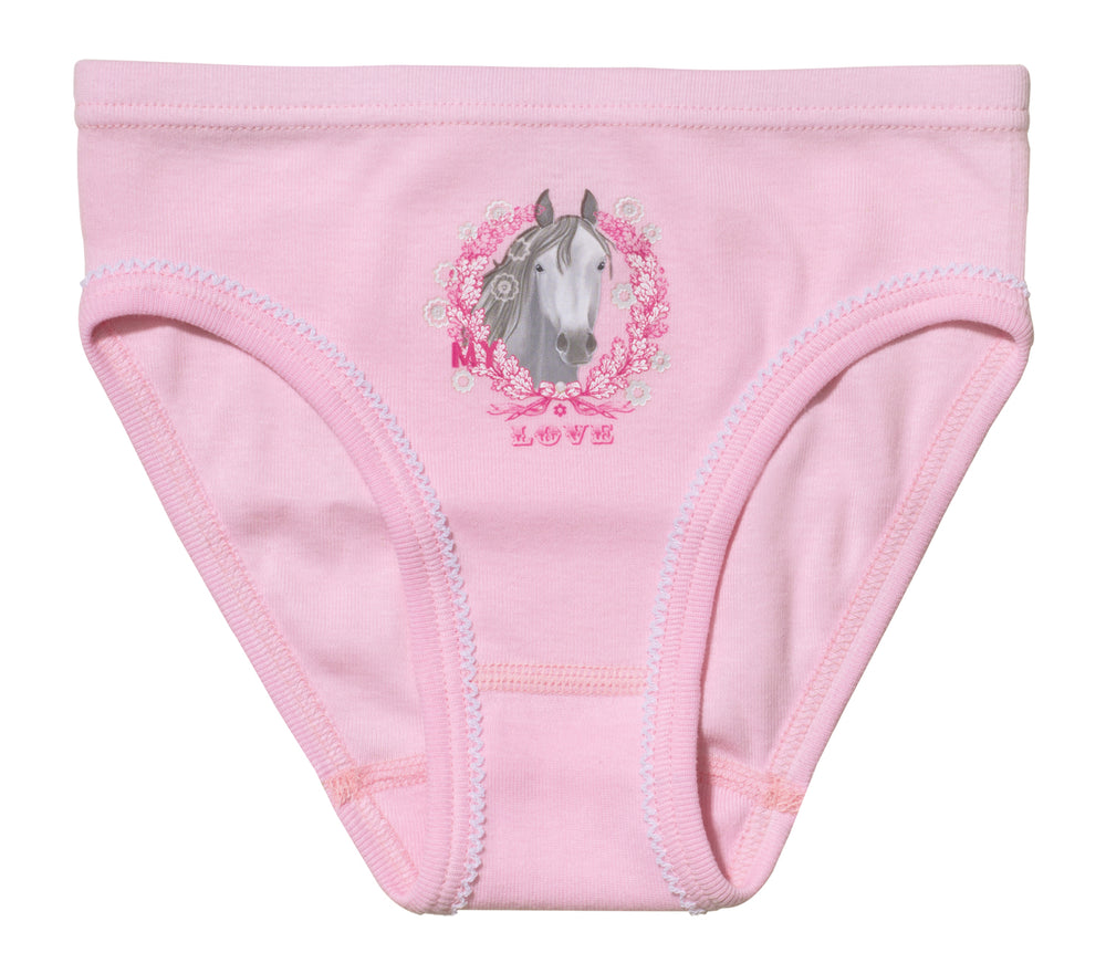 Die Mädchen Slips der Marke Sweety for Kids aus 100% Baumwolle in Feinripp Qualität im preisgünstigen Doppelpack. Das Material ist hautfreundlich und sorgt durch einen komfortablen umsäumten Gummibund für ein optimales Tragegefühl. Ein natürlicher Veredelungsprozess sorgt auch nach vielen Waschgängen für eine gute Optik. Die Slips sind in rosa oder weiß erhältlich. Beide haben dabei zusätzlich einen Pferdemotiv „My Love“ auf der Vorderseite. Die kontrastierenden Nähte am Bein sorgen dabei für das kleine charmante Datei.