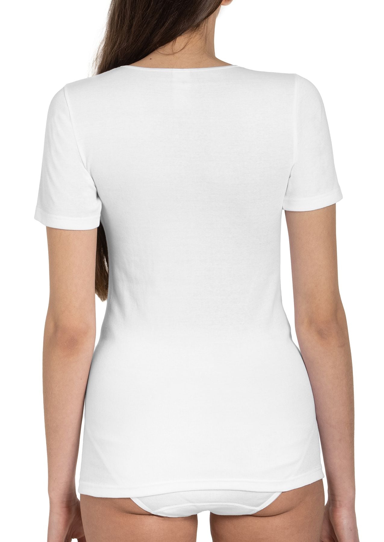 Das körperbetonte halbarm Shirt mit Rundhals schmiegt sich einwandfrei dem Körper an. Die Ausschnittkante ist mit einem edlen Glanzsatinband verfeinert und gibt dem Teil so das besondere etwas. Die 100% Baumwolle (kbA) in Feinripp Qualität macht das Teil zum pflegeleichten Daily-Begleiter. Einfach guter Tragekomfort, hautfreundlich und ganz ohne störende Seitennähte.